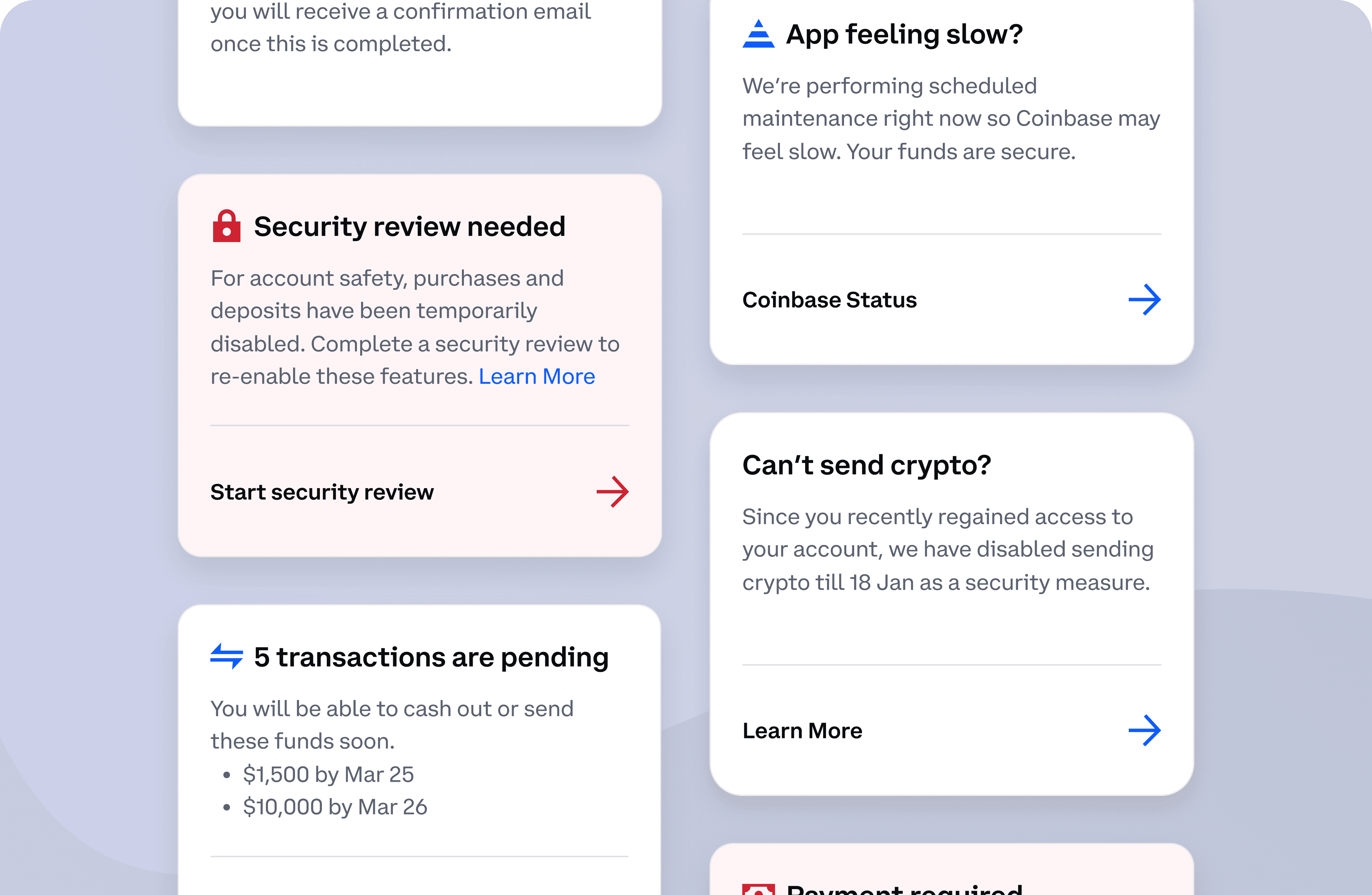 The quick help cards on the help center homepage offer proactive support to customers by surfacing any issues detected on the customers account and offer a self-serve solution for it.